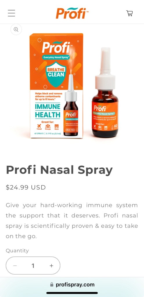I learned about Profi from a PAPR (powered air purifier respirator) group on FB when they invited the scientists who developed it to give a presentation about it and share their testing and evidence of its efficacy. After getting that information, I decided to now add this to my arsenal of mitigation tools for myself and family to use, especially in instances where we could be overexposed by sick people (I’ve been seeing people literally sick for months from one illness to the next) and when wearing a mask may not be possible. Daily use is safe for people 12 and up (and maybe younger due to nontoxic ingredients though one should check with your doctor on this). With any supplement or spray, it’s recommended to skip a few days every few months to reset then restart. Also, remember to blow your nose first, wipe, then spray/swab as with any nasal spray or gel.